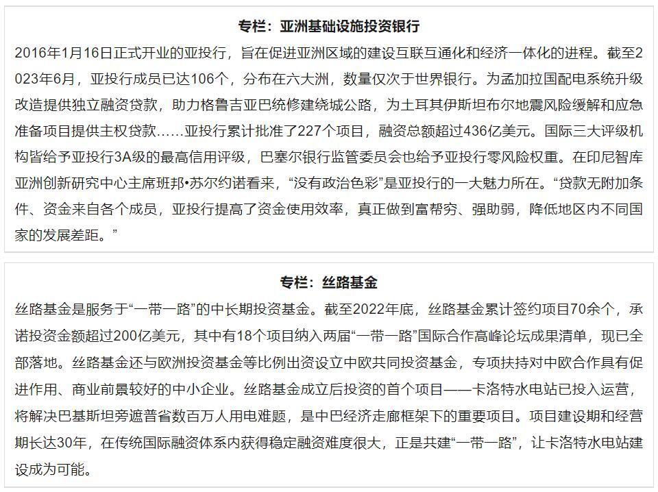 共建“一帶一路”積極開拓多元化、多層次融資渠道,為新興經濟體和發(fā)展中國家經濟增長“輸血”。亞洲基礎設施投資銀行(亞投行)、絲路基金、中國開發(fā)性和政策性銀行及商業(yè)金融機構,與世界銀行、歐洲復興開發(fā)銀行、亞洲開發(fā)銀行等多邊開發(fā)機構以及國際和本地金融機構積極合作,形成透明、高效、互利的共建“一帶一路”投融資朋友圈。
