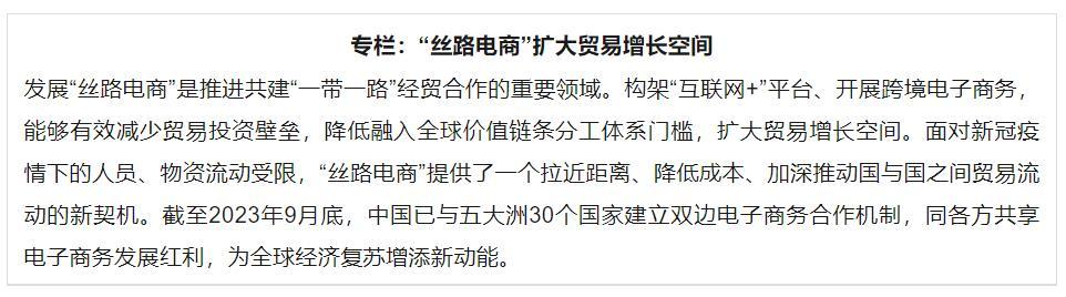 締結貿易協(xié)定和擴大市場準入能夠有效提振貿易。共建“一帶一路”通過創(chuàng)新貿易方式、搭建貿易平臺,打通貿易堵點,激活共建國家貿易潛能,為全球貿易大環(huán)流注入新動力。這些努力包括:打造以中國國際進口博覽會為引領的矩陣式商品展會,同世界共享中國市場機遇;簽署或升級自由貿易協(xié)定,共同建設自由貿易區(qū)網絡;推動跨境電商發(fā)展,為拓展貿易增長空間提供新可能;深化海關貿易安全和通關便利化合作,提升貿易便利化水平。[13]