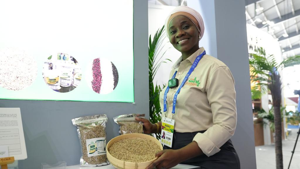 在第三屆中非經(jīng)貿(mào)博覽會(huì)上,來(lái)自莫桑比克夢(mèng)想農(nóng)業(yè)公司的展商胡克薩娜·薩伊德在展示芝麻產(chǎn)品(6月30日攝)。新華社記者 劉杰 攝