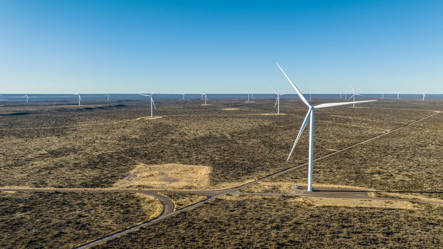 這是6月12日在阿根廷丘布特省馬德林港拍攝的羅馬布蘭卡一期風(fēng)電場(航拍照片)。新華社記者 王天聰 攝