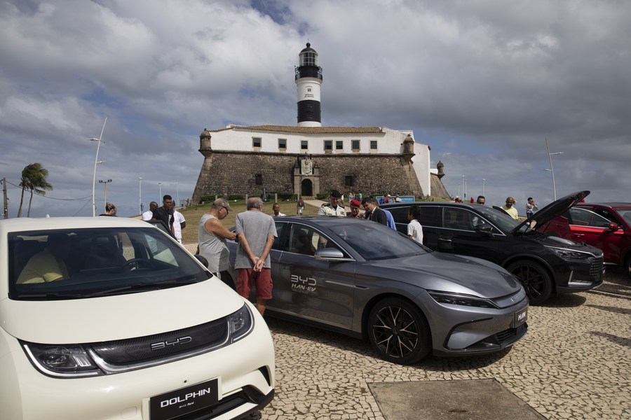 7月4日,參觀者在巴西巴伊亞州首府薩爾瓦多觀看比亞迪純電動汽車。新華社記者 王天聰 攝