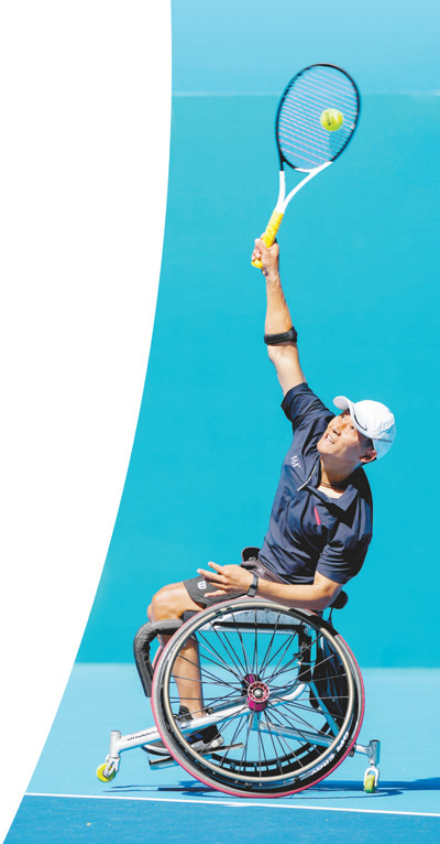 杭州亞殘運(yùn)會(huì)輪椅網(wǎng)球男子單打比賽,中國(guó)體育代表團(tuán)運(yùn)動(dòng)員董順江在比賽中。記者 厲衍飛攝
