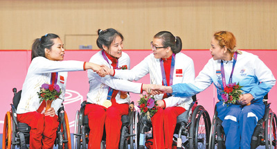 杭州亞殘運(yùn)會(huì)輪椅擊劍女子花劍個(gè)人B級(jí)決賽,中國(guó)體育代表團(tuán)運(yùn)動(dòng)員和泰國(guó)體育代表團(tuán)運(yùn)動(dòng)員(右)在頒獎(jiǎng)儀式上握手致意。新華社記者 胡星宇攝