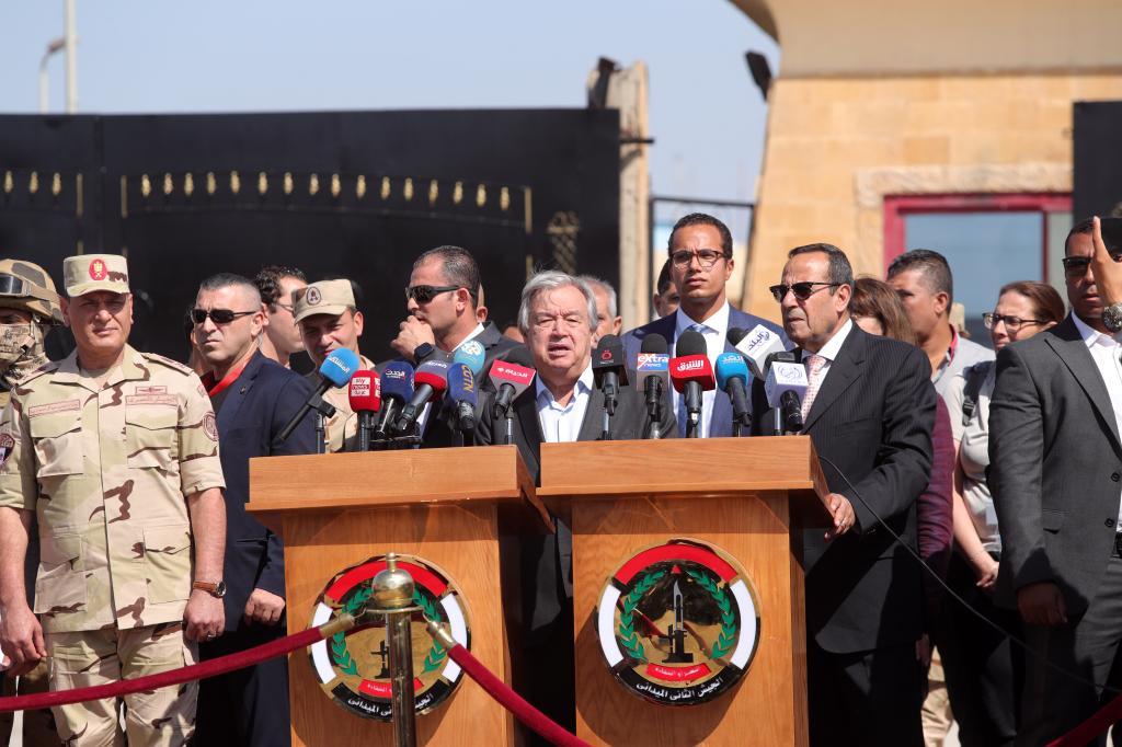 10月20日,在拉法口岸埃及一側,聯(lián)合國秘書長古特雷斯(中)發(fā)表講話。新華社發(fā)(艾哈邁德·戈馬攝)