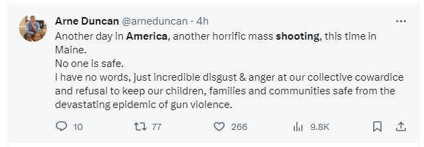 網(wǎng)友“Arne duncan”表示,美國的又一天,又一起可怕的大規(guī)模槍擊案,這次發(fā)生在緬因州。沒有人是安全的。我無言以對,只是對我們集體的懦弱和拒絕保護(hù)我們的孩子、家庭和社區(qū)免受槍支暴力感到十分厭惡和憤怒。