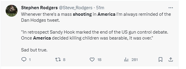 網(wǎng)友“stephen Rodgers”稱,每當(dāng)美國發(fā)生大規(guī)模槍擊事件時,我總會想起丹·霍奇斯的推特:‘回想起來,桑迪胡克槍擊案標(biāo)志著美國槍支管制辯論的結(jié)束。一旦美國認(rèn)為殺害兒童是可以忍受的,一切就結(jié)束了?!瘋麉s真實。