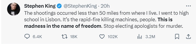 作家斯蒂芬·金(Stephen King)居住在距離此次槍擊事件發(fā)生地不到50英里(約80公里)的地方,他26日在社交平臺上發(fā)文稱,這是以自由之名行瘋狂之實!請停止為謀殺辯護!