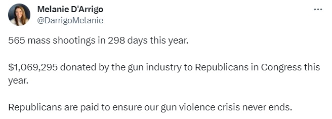 更有網(wǎng)友諷刺稱,面對著今年298天內(nèi)的565場大規(guī)模槍擊事件,美國共和黨選擇拿著槍支行業(yè)的錢,來確保美國的槍支暴力絕不結(jié)束。