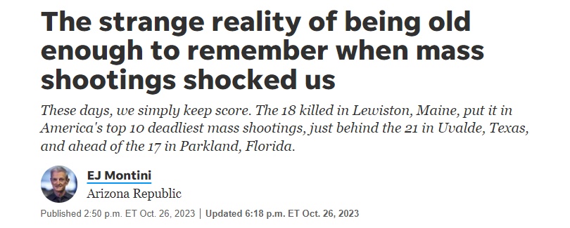 中國日報網(wǎng)10月28日電 《今日美國報》(USA Today)網(wǎng)站刊登EJ Montini的文章稱,美國緬因州劉易斯頓市25日發(fā)生的槍擊案以18人死亡的悲慘程度 “入選”美國十大最致命的大規(guī)模槍擊事件,死亡人數(shù)僅次于得克薩斯州烏瓦爾德的21人,高于佛羅里達州帕克蘭的17人。而且在緬因州槍擊案中,仍有傷者處于危機狀態(tài),生死未卜。
