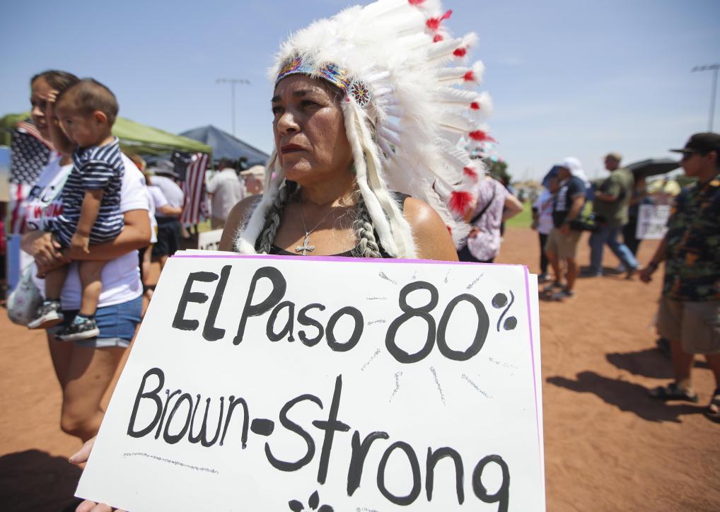 2019年8月7日,在美國(guó)得克薩斯州埃爾帕索市,印第安裔美國(guó)人普麗西拉·佩雷斯手舉標(biāo)語(yǔ)參加反種族主義集會(huì)。新華社記者王迎攝