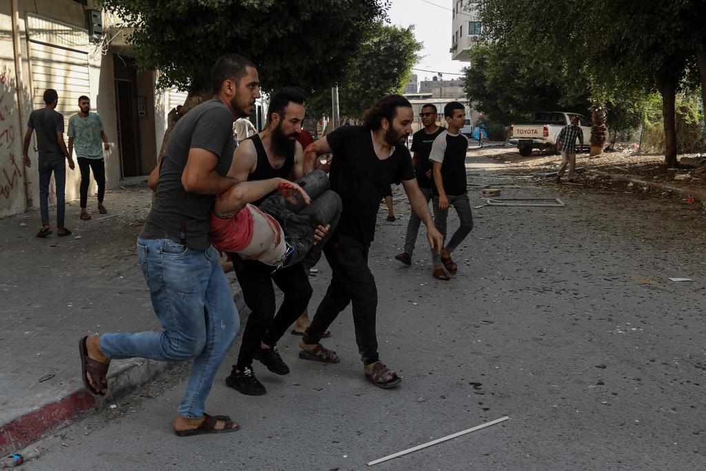 11月2日,人們?cè)诩由吵窃庖攒娍找u后轉(zhuǎn)移傷者。新華社發(fā)