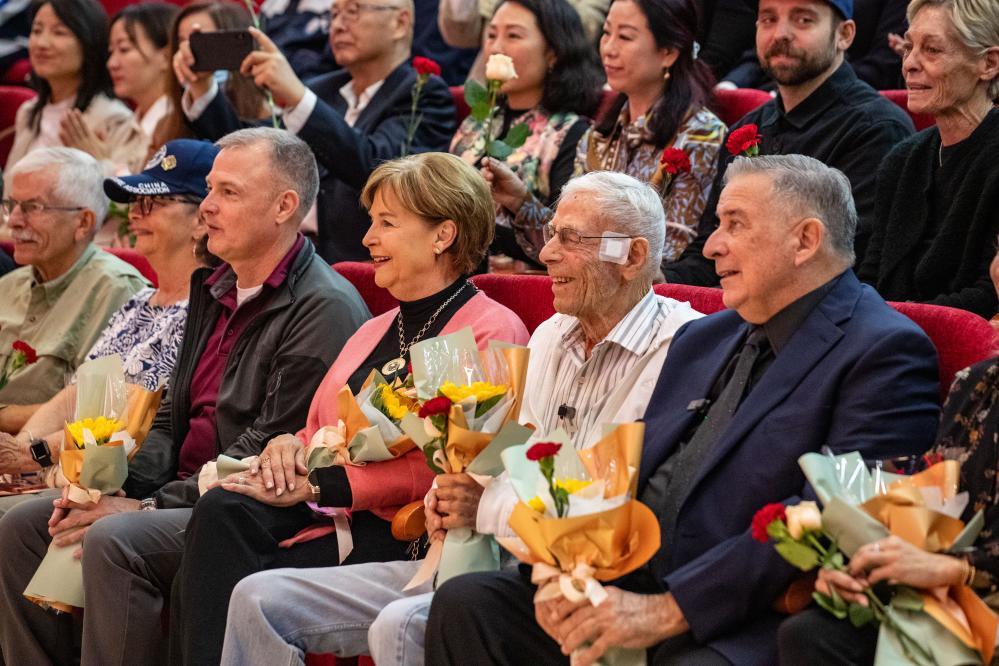 在看完講述飛虎隊(duì)開(kāi)辟駝峰航線故事的音樂(lè)劇《翠堤長(zhǎng)虹》后,飛虎隊(duì)老兵哈里·莫耶同昆明市外國(guó)語(yǔ)學(xué)校的師生唱起《友誼地久天長(zhǎng)》,這位平日里愛(ài)開(kāi)玩笑、風(fēng)趣幽默的百歲老人潸然淚下。