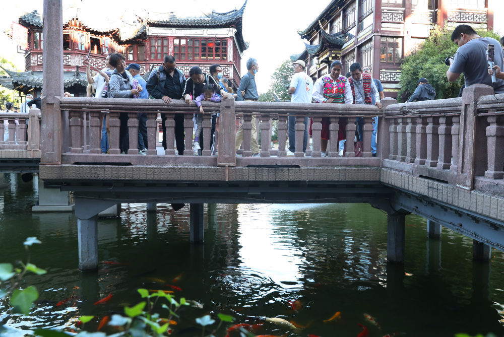 ↑馬馬尼大叔和妻子格洛麗亞在上海豫園游玩時(shí)觀看水中的錦鯉(11月2日攝)。