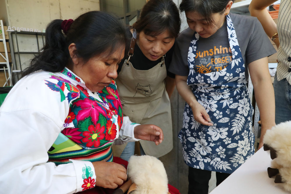↑馬馬尼大叔的妻子格洛麗亞在“溫暖駝”品牌位于上海的倉(cāng)庫(kù)內(nèi)向本地員工演示羊駝玩偶修補(bǔ)的針?lè)ǎ?1月2日攝)。