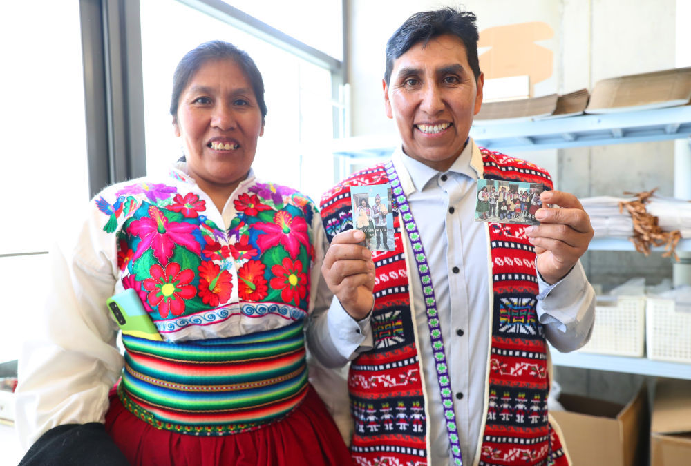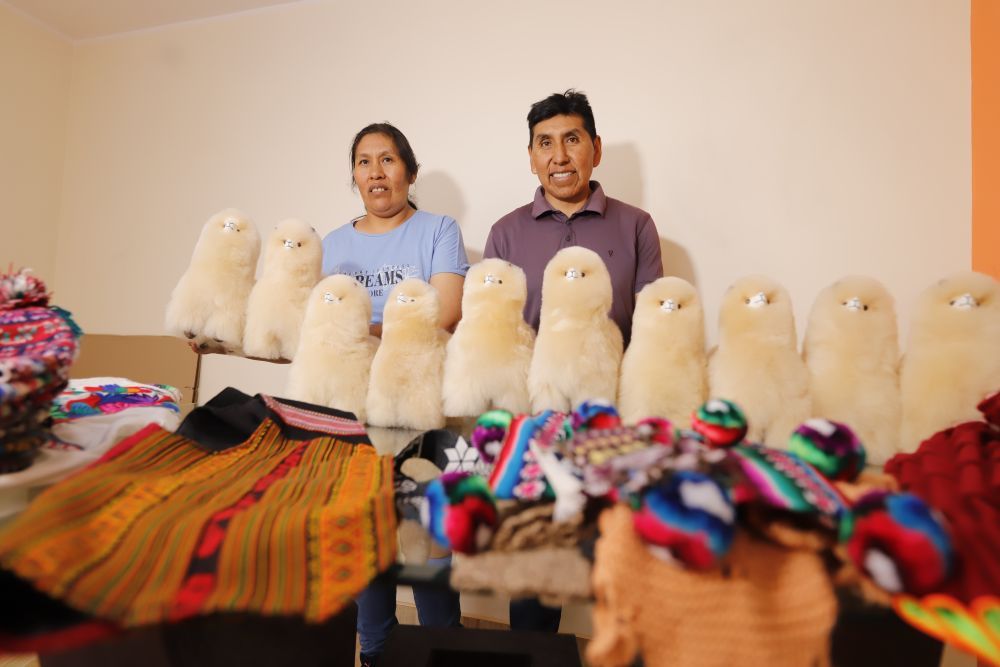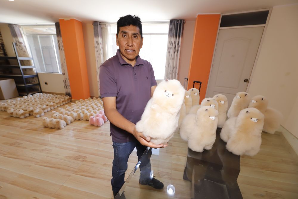 ↑在秘魯南部城市阿雷基帕,馬馬尼大叔準(zhǔn)備將在上海進(jìn)博會(huì)上展示的羊駝玩偶(10月27日攝)。