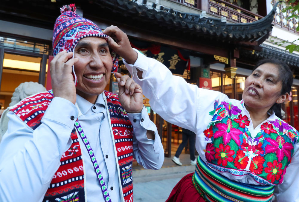 ↑馬馬尼大叔游覽上海豫園時(shí)演示如何佩戴傳統(tǒng)秘魯針織小帽(11月2日攝)。