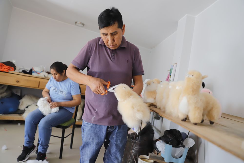 ↑在秘魯南部城市阿雷基帕的工坊內(nèi),馬馬尼大叔和妻子格洛麗亞打磨準(zhǔn)備在上海進(jìn)博會(huì)上展示的羊駝玩偶(10月27日攝)。