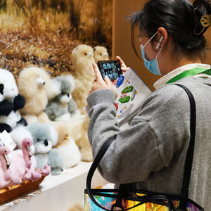 ↑11月7日,參觀者在上海進(jìn)博會(huì)“溫暖駝”品牌展臺(tái)挑選羊駝玩偶。