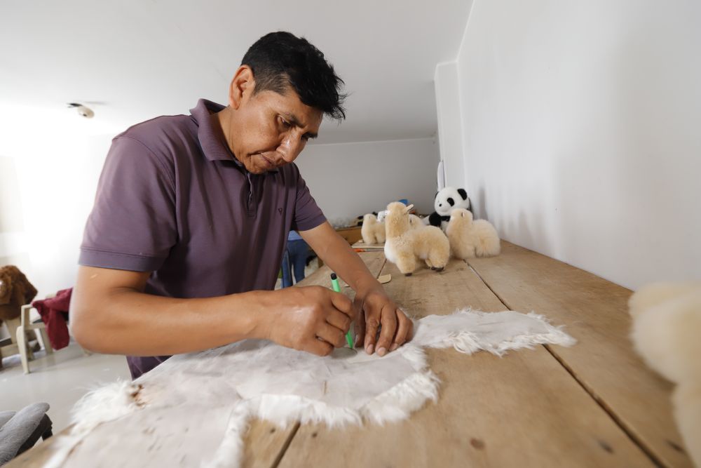 ↑在秘魯南部城市阿雷基帕的工坊內(nèi),馬馬尼大叔制作羊駝手工藝品(10月27日攝)。