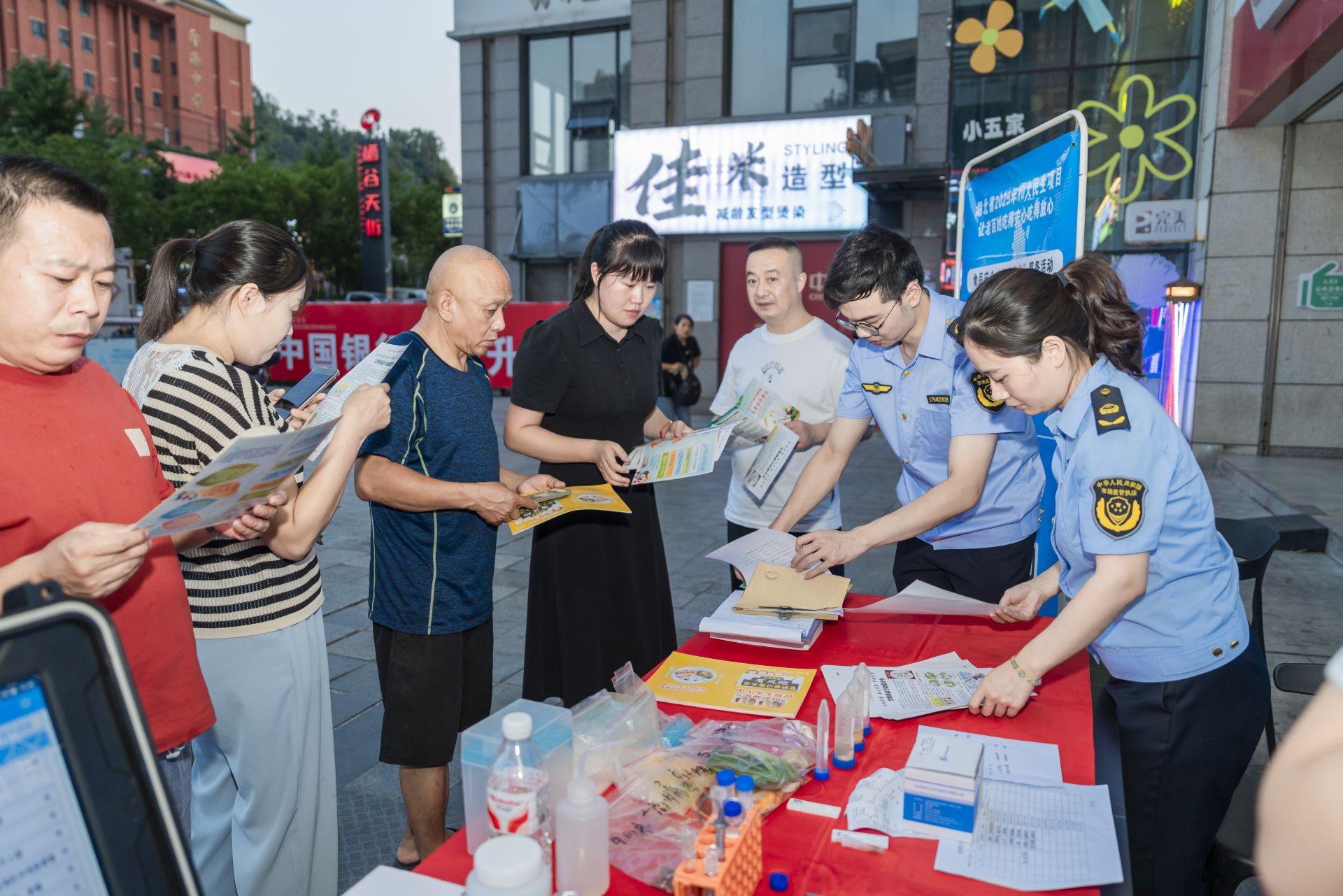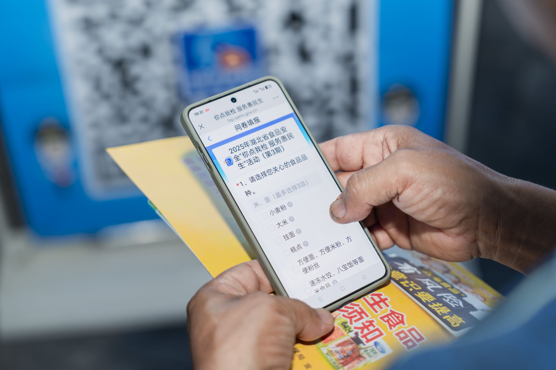 “大叔,您用手機(jī)掃一掃這個(gè)二維碼,就可以參與點(diǎn)選。”在活動(dòng)現(xiàn)場,市場監(jiān)管工作人員向來往群眾發(fā)放調(diào)查問卷及食品安全科普資料,并邀請(qǐng)消費(fèi)者通過掃碼進(jìn)入“你點(diǎn)我檢 服務(wù)惠民生”民意征集系統(tǒng),勾選自己關(guān)心的食品種類、經(jīng)營場所、檢測項(xiàng)目?!跋奶焯鞖鉄?,都愛點(diǎn)外賣,希望你們多檢測一下”。在問卷征集過程中,不少消費(fèi)者提出比較關(guān)注外賣食品安全。