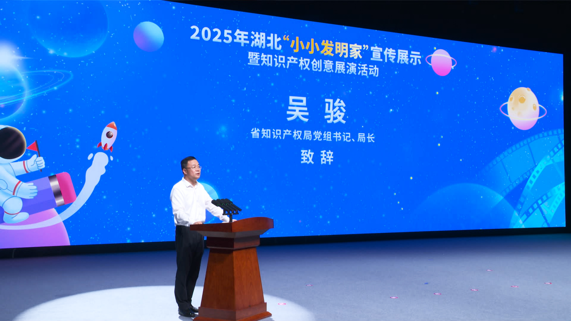 活動在武漢市光谷第二十一小學(xué)樂隊和機器人共同帶來的開場秀《閃耀明天》中拉開帷幕。湖北省知識產(chǎn)權(quán)局黨組書記、局長吳駿致辭表示,此次活動旨在為全省熱愛科學(xué)、勇于創(chuàng)新的青少年們搭建一個激發(fā)靈感、展示才華、交流互鑒的廣闊平臺,讓創(chuàng)新的種子在幼小的心靈中生根發(fā)芽,讓知識產(chǎn)權(quán)的理念在青春的土壤里茁壯成長。他親切寄語“小小發(fā)明家”,永葆好奇之心,敢于提問,善于思考,勤于動手,將天馬行空的想象變成創(chuàng)新創(chuàng)造的作品;初識知識產(chǎn)權(quán),了解它、尊重它、運用它,學(xué)會保護創(chuàng)意,尊重發(fā)明創(chuàng)造;同時志存高遠(yuǎn),將今天的興趣發(fā)展成為明天的志向,努力成長為科技自立自強的棟梁之材。